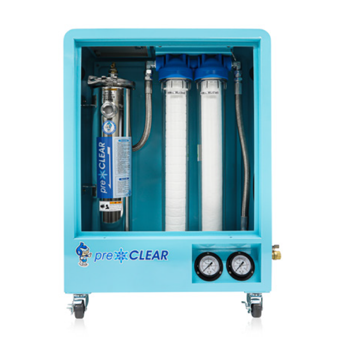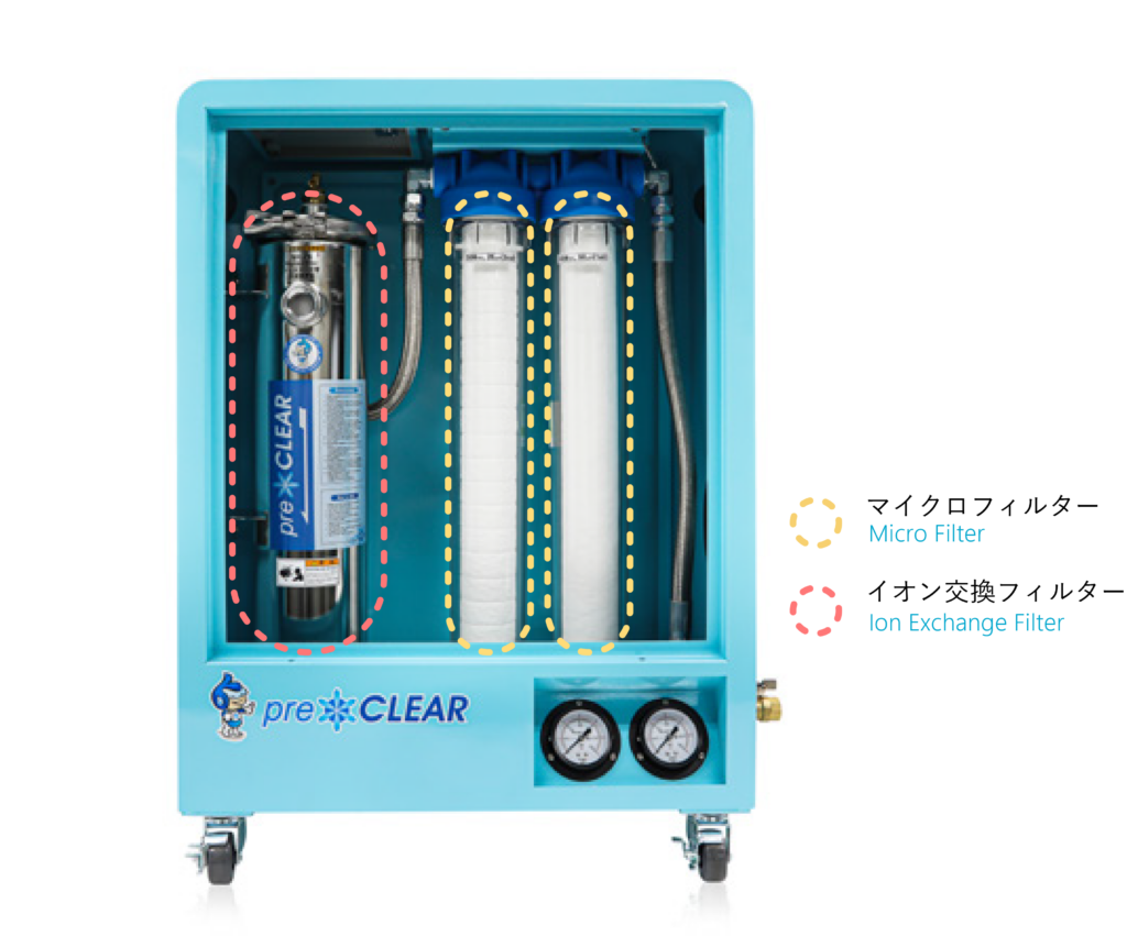 preCLEARは、2つのマイクロフィルターと1つのイオン交換フィルターで構成されています。冷却水が供給されると、まず一次フィルター(50μm)、続いて二次マイクロフィルター(25μm)が順次ろ過を行い、粒子サイズに応じて浮遊物を除去。最後にイオンフィルターでイオン交換を行い、冷却水を軟水化します。