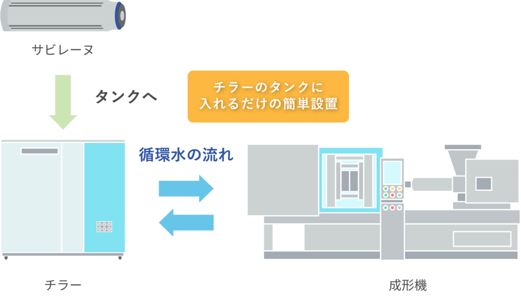 サビレーヌは、チラー内のタンクに入れるだけで簡単に設置し、使用することができます。特別な配管工事を必要とせず、既存の温度調節システムにそのまま導入が可能です。定期的な掃除を行うことで、効果は約2年間持続します。