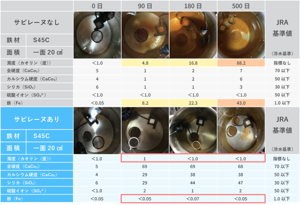 ステンレス容器内に水を張り、鉄材(S45C)を浸漬させることで、冷却循環水環境を模した実験を実施しました。本試験では、サビレーヌの有無による赤錆発生状況を比較しています。