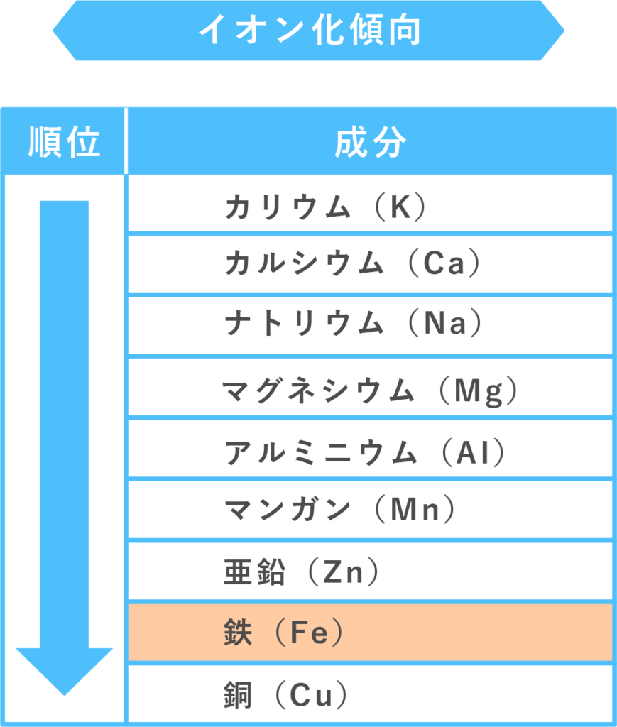 金属には、電子を失いイオン化(酸化)しやすいものとしにくいものがあり、この性質はイオン化傾向として知られています。アルカリ金属・アルカリ土類金属は鉄よりもイオン化傾向が高く、先に酸化されやすい性質を持っています。そのため、これら金属イオンが冷却循環水中に存在する環境では、鉄は相対的にイオン化しにくい状態となり、結果として赤錆(酸化鉄)の発生が抑えられます。