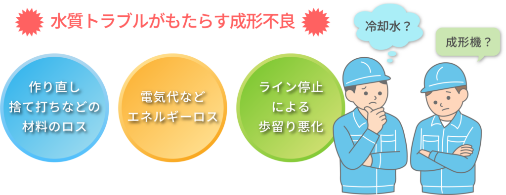 循環水の状態は、単なる設備保全にとどまらず、成形品の品質そのものを左右する重要な要素です。赤錆・スケール・バイオフィルムなどの付着は温調精度を乱し、生産性の低下やトラブルの発生リスクを高めます。