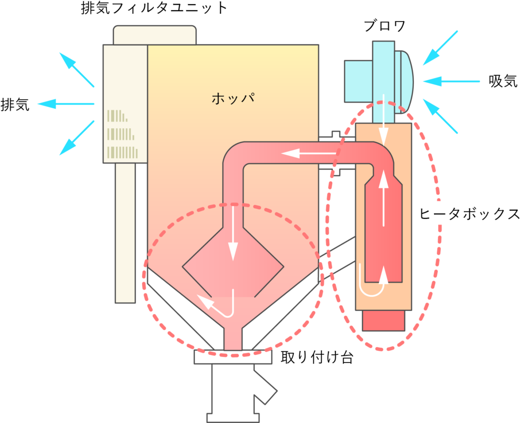由鼓风机吸入的外部空气,通过实施了整流对策的加热器部分,从排出口均匀分散。通过优化热风的流动,可均匀地向料斗内部整体供给,将设定温度与树脂温度的差控制在最小限度。
